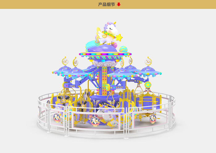 梦幻独角兽是以童话世界为主题的12座新型自控飞机类儿童游乐设备。它除了拥有传统的旋转类游艺机的特点外,同时还注入了在运行过程中乘客通过脚踩或者拉杆控制座舱上升下降,仿佛乘坐在空中飞翔,又有一种在空中飘舞的感觉,给人一种与众不同的乘座感受。 该机械游乐设备具有安全可靠、操作简单、安装方便等特点。