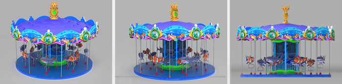 Sea World is a 12-seat carousel amusement equipment with the theme of marine animals. Tourists ride on the backs of various beautiful marine animals and enjoy the fun of swinging up and down and back and forth when the animals swim, as if they are playing in the seabed. This equipment is very popular among tourists. The mechanical amusement equipment has the characteristics of safety and reliability, simple operation, convenient installation and low noise.